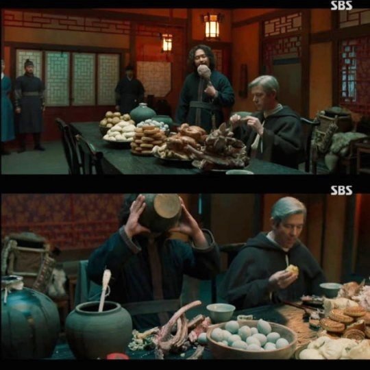 극 중 조선의 기생집에서 충녕대군이 구마사제에게 중국음식인 월병·피단 등을 대접하는 장면. 사진 SBS '조선구마사'