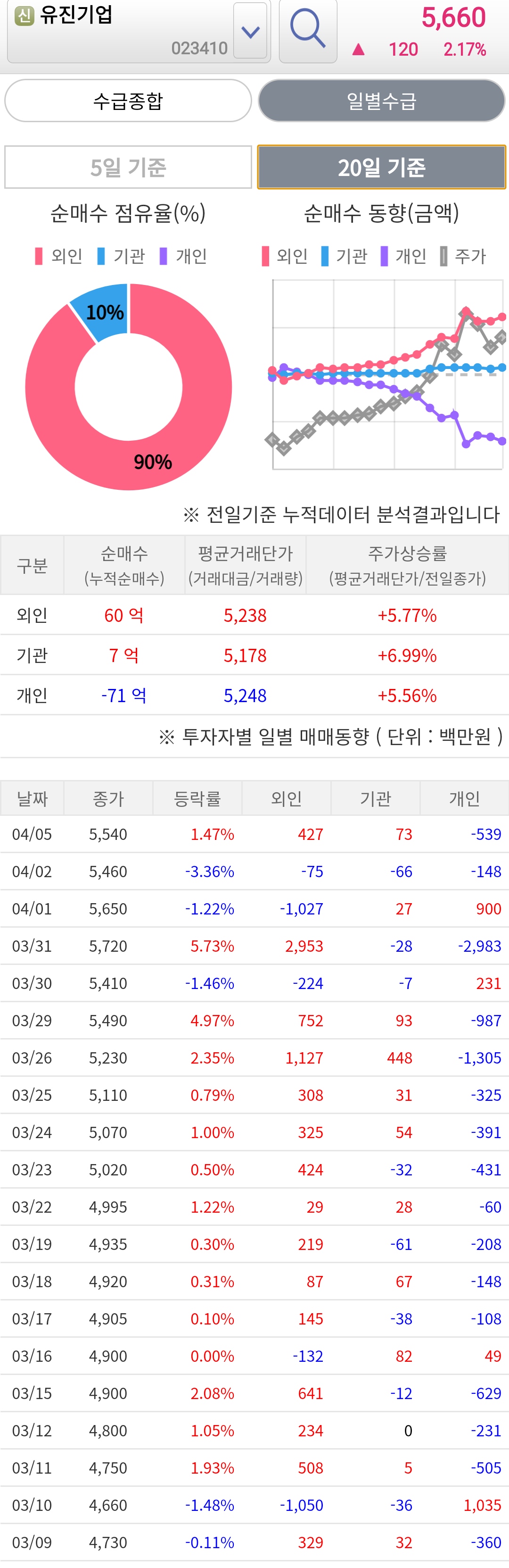 [투자자별일일매매동향-유진기업] [일별수급 20일기준] 외인 매수 따라 주가 상승 개인 완전 털림 기관 유지 레미콘 제조, 판매 건설업 주요사업 시멘트 골재 건자재 생산, 판매