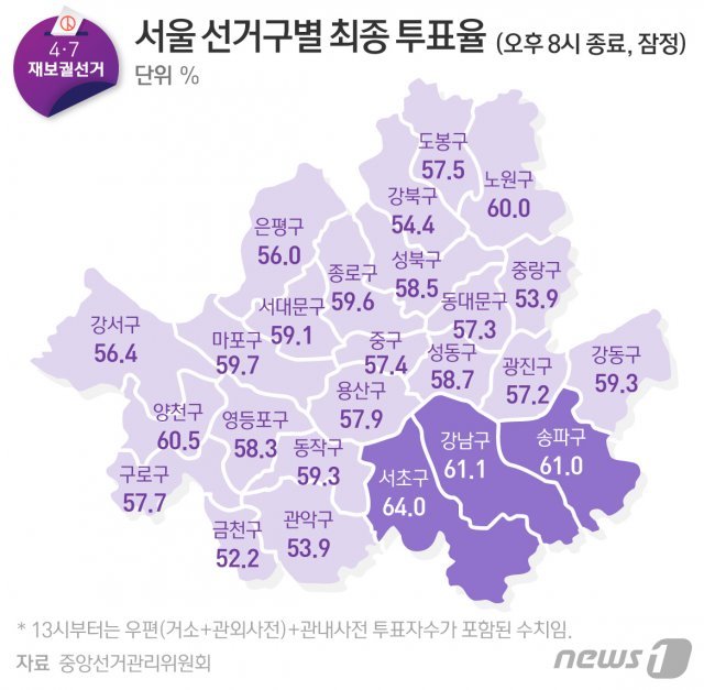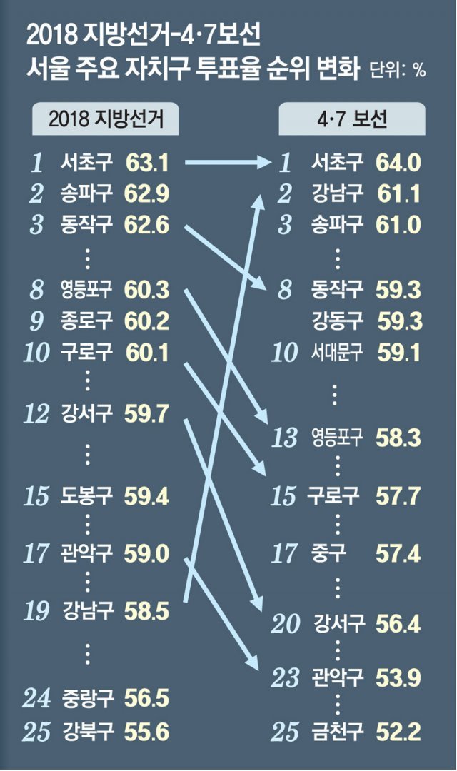 중앙선거관리위원회에 따르면 서울 25개 자치구 가운데 서초구의 투표율이 64%로 가장 높았고, 강남 61.1%, 송파 61%, 양천구 60.5% 순으로 집계됐다. 재건축 대기 아파트들이 밀집해 있는 ‘강남 3구’와 양천구가 투표율 1~4위를 나란히 기록한 것. 강남 3구는 여당이 압승한 지난해 총선에서 국민의힘이 8석 중 7석을 석권할 정도로 야당의 텃밭이기도 하다.