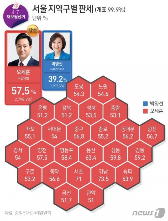 4·7 서울시장 보궐선거에서 승리한 국민의힘 오세훈 후보는 서울 25개 모든 자치구에서 더불어민주당 박영선 후보를 이긴 것으로 나타났다. 2018년 지방선거 때 민주당 박원순 후보가 서울 전 지역을 석권한 지 3년 만에 여야의 득표가 정반대로 뒤집힌 결과가 나온 셈이다.