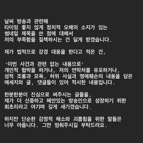 박하명 기상캐스터 "정치적 오해 소지 인정...그만 멈춰주시길" [전문]
