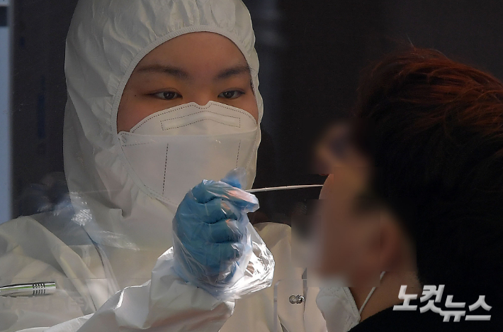 임시선별검사소에서 의료진이 검체를 채취하고 있다. 박종민 기자