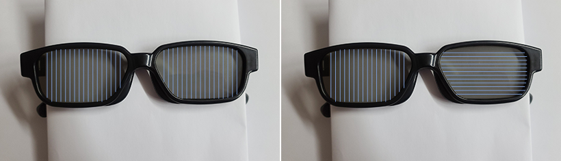 ▲ 왼쪽 안경은 운전이나 낚시를 하는 경우 적합한 편광선글라스로 편광축이 수직이다. 오른쪽 안경은 입체 영화를 볼 때 적합한 편광판이 장착된 안경으로 좌우의 편광축이 서로 직교된 상태다.