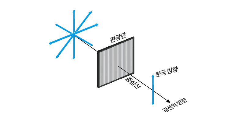 우리가 보는 햇빛과 같은 자연광과 백열등이나 형광등, 촛불 등의 불빛에는 모든 방향으로 진동하는 빛이 섞여 있다. 즉, 빛이 사방으로 퍼져 나간다는 뜻이다. 그런데 이렇게 모든 방향으로 진동하는 빛이 편광판을 통과하게 되면 오로지 특정 방향으로만 진동하는 빛만 통과하게 된다. 이렇게 한 방향으로만 진동하는 빛을 바로 ‘편광(偏光)’이라고 한다. 단어의 뜻 그대로 ‘치우친(偏)’ 빛이다. 편광판의 개념은 감옥에 있는 세로로 된 쇠창살을 떠올리면 쉽다. 편광판 안에 우리 눈에는 보이지 않는 세로로 된 쇠창살이 있다고 생각해보자. 그러면 그 편광판은 세로로 즉, 수직으로 편광된 평면파만 통과할 수 있다. 그러므로 편광판은 특정 방향으로만 진동하는 빛을 걸러내는 역할을 할 수 있는 것이다.