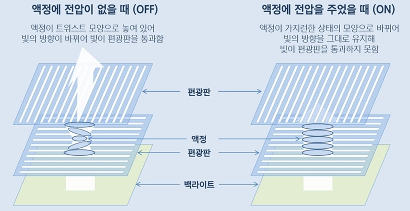 ▲ 왼쪽 그림은 전류가 흐르지 않는 상태로, 액정이 서로 비틀어진 형태로 놓여 있어 빛이 휘면서 통과할 수 있다. 한편, 오른쪽 그림은 전류가 흐르는 상태로, 액정이 가지런하게 정렬돼 있어 빛이 편광판을 통과하지 못한다.