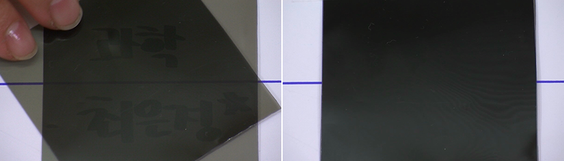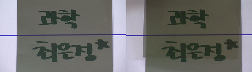 ▲ 왼쪽은 하나의 편광판만 글씨 위에 올려두었다. 오른쪽은 위쪽에 편광판을 하나 더 올렸다. 하지만 올려놓은 편광판이 같은 방향이라 한 장만 깔아 놓은 상태랑 별로 다르지 않다. 둘 다 글씨가 잘 보인다.