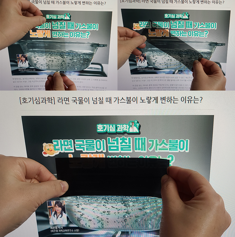 ▲ 모니터 앞에서 편광판을 손에 들고 방향을 바꿔 보면 편광판을 통과한 빛의 밝기가 달라지는 것을 알 수 있다. 디스플레이에서 방출된 빛은 편광판을 통과한 빛이므로, 한쪽 방향으로만 진동하는 편광이다.