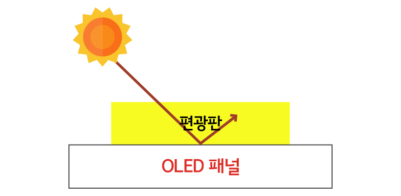 두 장의 편광판이 장착된 LCD와 달리 OLED 디스플레이에는 백라이트가 없고, 편광판은 오로지 패널 바깥쪽에 1장만 사용된다. OLED 디스플레이는 OLED 소자와 TFT·전극으로 이루어져 있는데 이 TFT·전극을 구성하는 물질은 전기가 잘 통하는 금속 소재이다. 금속으로 된 물체는 이른바 금속성 광택이 나게 되는데, 이는 반사율이 높기 때문이다. 즉 OLED는 워낙 반사를 잘 하는데, 더구나 햇빛 아래에서는 그대로 빛을 반사하다 보니 화면을 보기가 힘들어질 수 있다. 이때 표면의 편광판이 반사방지 역할을 해서 화면을 선명하게 볼 수 있도록 돕는 역할을 하게 된다.