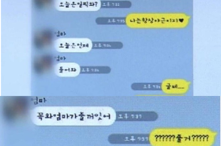 ◇ 김현정> 지금 저희가 유튜브와 레인보우로 실제 카톡 메시지를 보여드리고 있습니다. 엄마가 오늘 일찍 오니? 나는 항상 야근이지. 오늘은 언제 들어와? 글쎄. 꼭 와. 엄마가 줄 거 있어. 그래서 딸이 줄 거? 뭔데? 이런 대화네요.