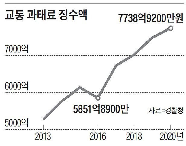 경찰청의 교통 과태료 징수액이 현 정부 출범 후 매년 증가해 지난해 징수액이 역대 최다인 7738억9200만원으로 19일 집계됐다. 경찰이 2017년부터 무인(無人) 과속 단속 카메라의 제한속도 허용 범위를 줄이면서 그만큼 단속 건수가 늘어난 것이 교통 과태료 징수액 증가 요인 중 하나로 꼽힌다. 야당은 “경찰의 교통 단속이 안전사고 예방보다는 과태료 징수에 초점을 맞춘 것 아니냐”고 했다.