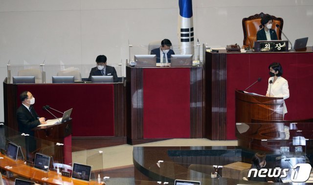 홍남기 국무총리 직무대행이 19일 오후 서울 여의도 국회 본회의장에서 허은아 국민의힘 의원의 질문에 답하고 있다. ⓒ News1