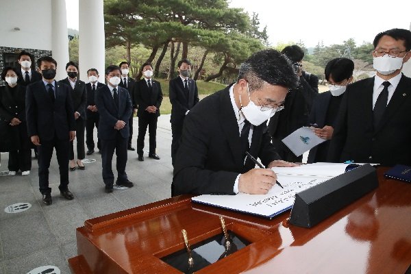더불어민주당 윤호중 원내대표 겸 비상대책위원장이 22일 오전 원내대표단과 서울 동작구 국립서울현충원을 참배한 뒤 방명록을 작성하고 있다. 2021.4.22. 사진공동취재단