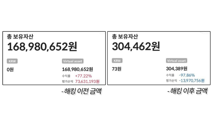 ◆ 해킹 피해자> 제가 정확하게 투자했던 시점은 이제 2월 달 초 정도 되고요. 정확하게 해킹 피해를 본 시점은 3월 20일 오후 11시 19분경에 제가 유튜브를 보고 있었는데 갑자기 제가 가지고 있었던 코인들이 저절로 매도가 되고 이상한 코인들이 매수가 되면서 자산을 갖고 있었던 금액들이 다 공중분해 되는 그런 해킹을 당했습니다.