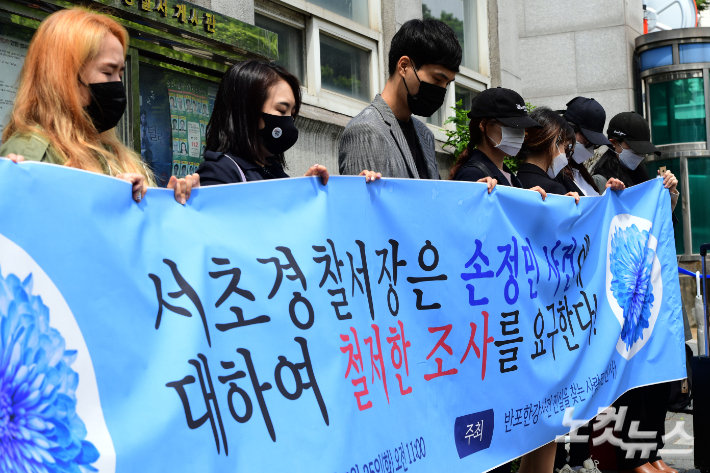 반포한강사건 진실을 찾는 사람들(반진사) 회원들이 25일 오전 서울 서초경찰서 앞에서 '고 손정민 사건 철저한 조사 요구' 기자회견을 갖고 있다. 황진환 기자