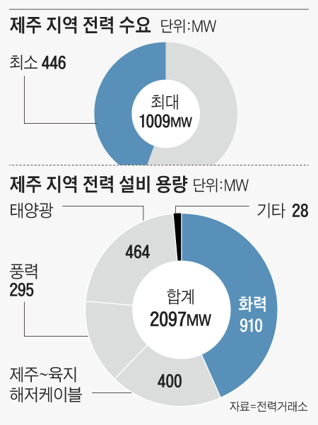 유네스코 세계자연유산으로 등재된 제주에 풍력과 태양광 발전 설비가 우후죽순 들어서고 있지만 가동을 중단하는 사례가 늘어나고 있다. 과잉생산되는 전력을 처리하는 방안을 찾지 못해 멈춰 세우는 것이다. 전력거래소에 따르면, 제주 지역 전력망에서 재생에너지 최대 수용 용량은 572MW(메가와트)다. 하지만 올 5월 기준 태양광은 464MW, 풍력은 295MW가 설치됐다. 이미 최대 수용 용량보다 30%나 많은 것이다.