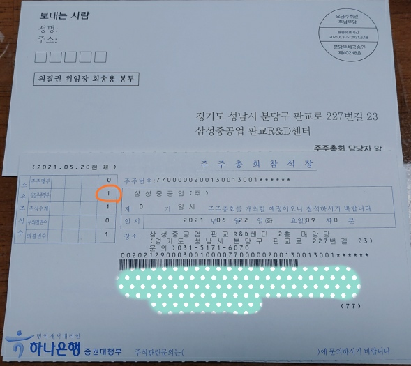 시간도 없고 돈도 없고, 딸랑 주식1주를 줏은 건데, 이걸로 인쇄를 하고 우편요금을 지불하고 봉투에 넣어서 우리집으로 배달을 해온 것이다.