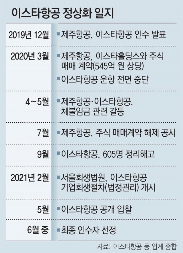 법원과 이스타항공 매각주관사는 입찰 평가를 거쳐 이르면 15일 입찰 결과를 공지할 계획이다. 이후 법원은 성정이 마지막으로 결정을 할 수 있도록 2, 3일 정도 기간을 준 뒤 이르면 21일 최종인수예정자를 선정할 예정이다. 최종인수예정자가 이스타항공에 대한 정밀 실사와 계약금 예치, 회생계획서 제출 등의 절차를 끝낼 경우 다음 달 20일쯤 매각 절차가 일단락된다.
