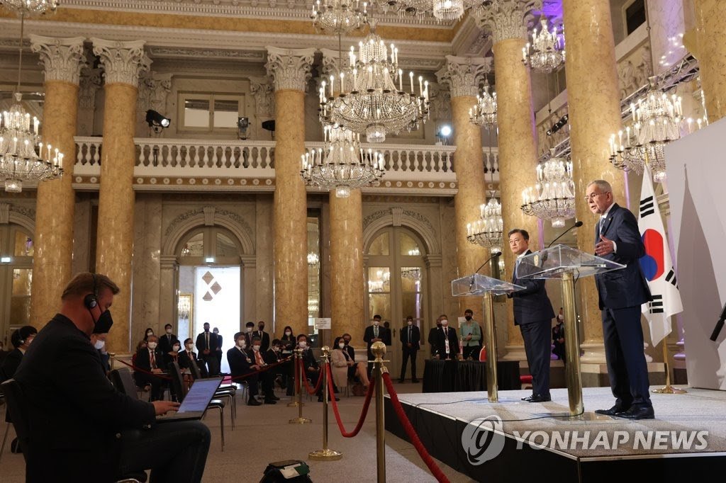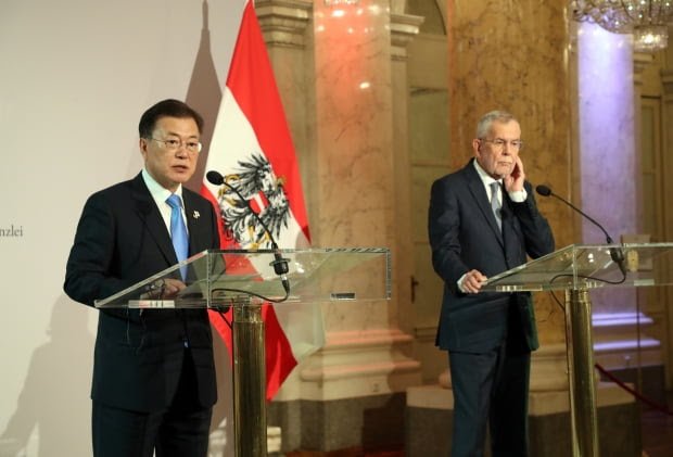 오스트리아를 국빈방문 중인 문 대통령은 이날 호프부르크궁에서 열린 알렉산더 판데어벨렌 대통령과의 정상회담 직후 공동기자회견에서 "한국이 글로벌 백신 허브 역할을 할 경우 북한도 당연히 협력 대상이 된다"며 이같이 말했다.문 대통령의 이 같은 구상은 신종 코로나바이러스 감염증(코로나19) 팬데믹 극복을 위해 한국이 글로벌 백신 생산 허브로서 적극적인 역할을 하겠다는 계획과 맞물려 있다.