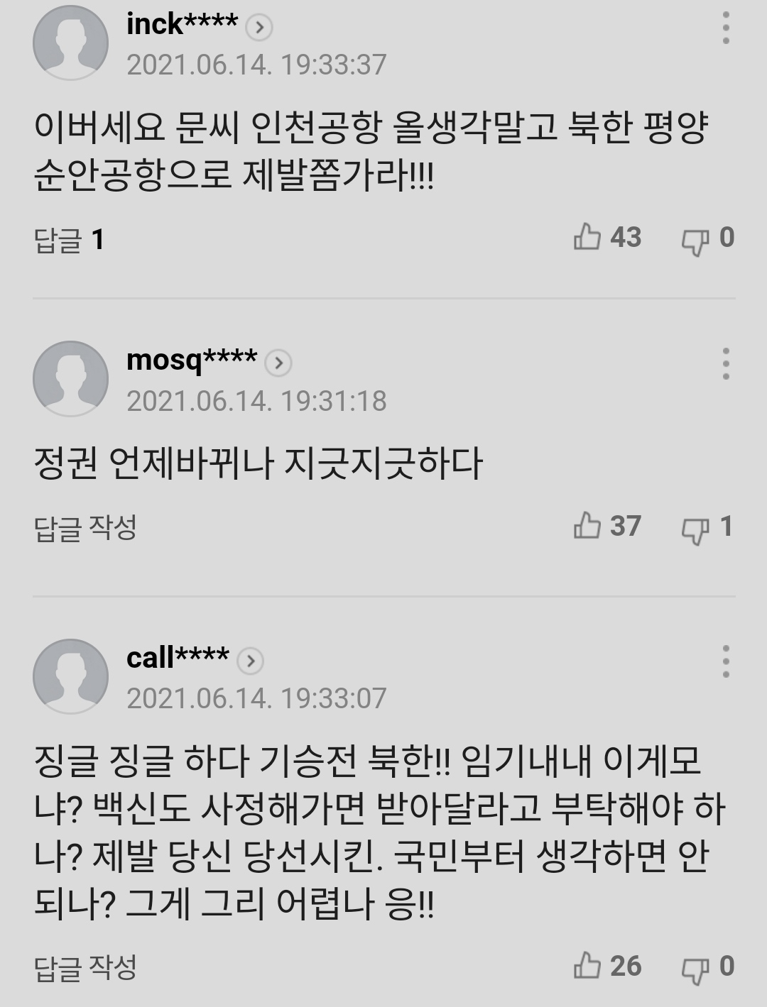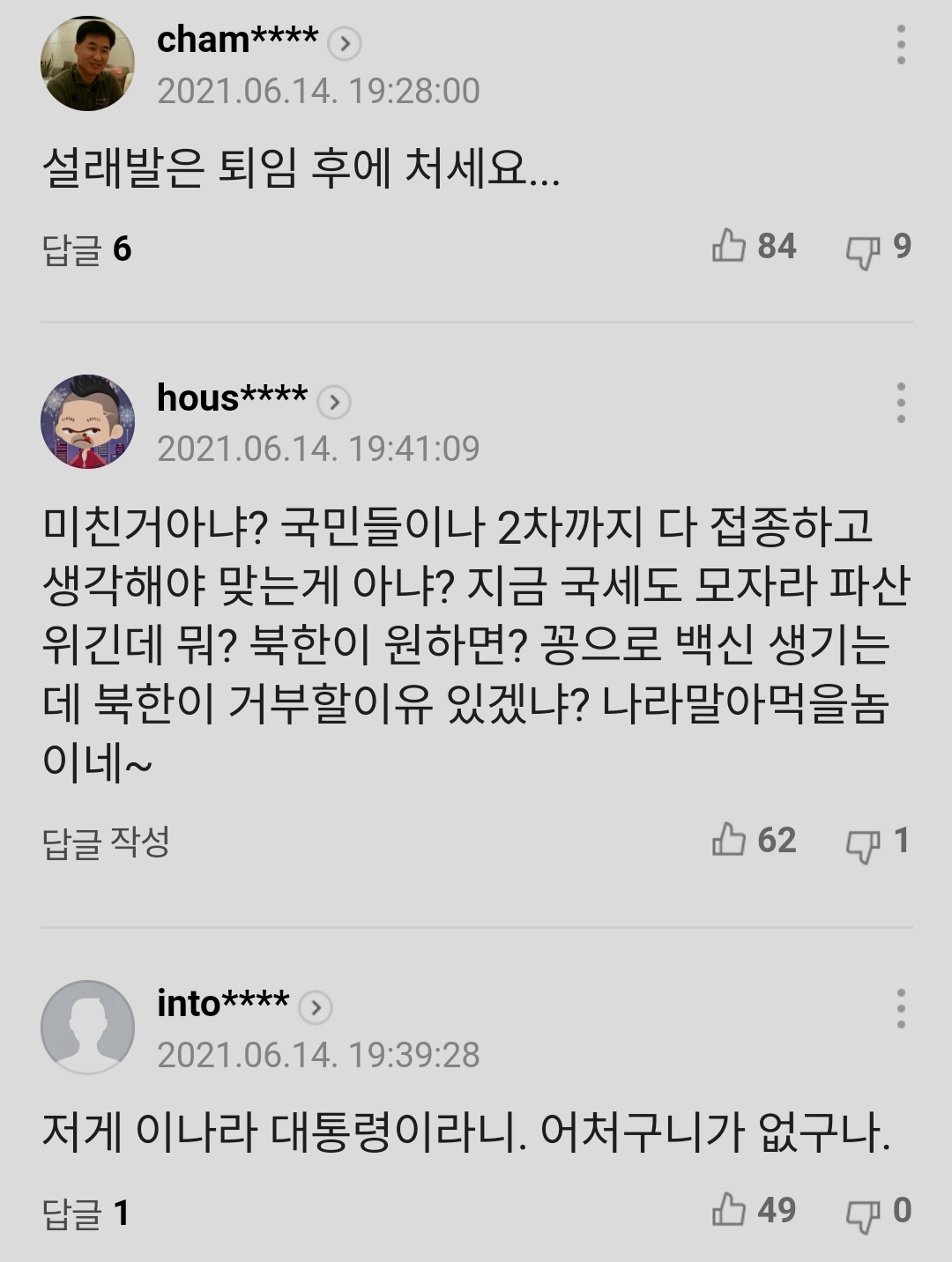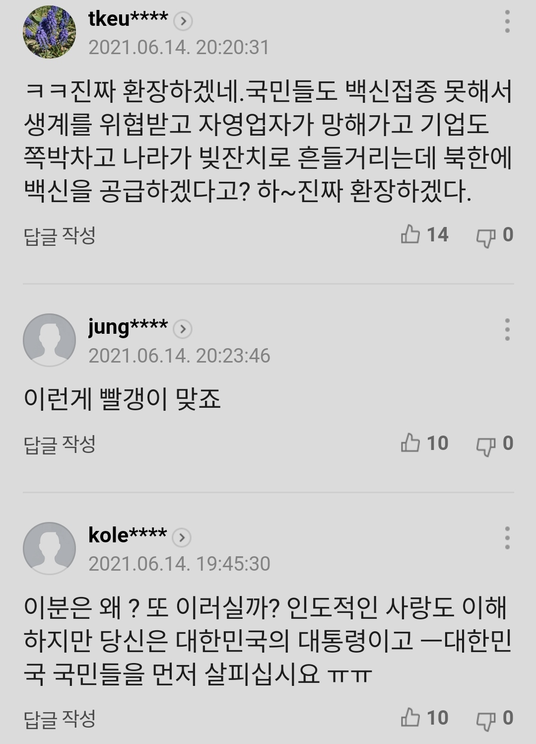 문대통령 "北 동의 시 백신공급 협력 적극 추진" 댓글이 더 웃겨 동북아 방역보건협력체 이어 백신공급 제안 美, 대북 인도주의적 협력 적극 지지 오스트리아 대통령 北 신호 있다면 도움
