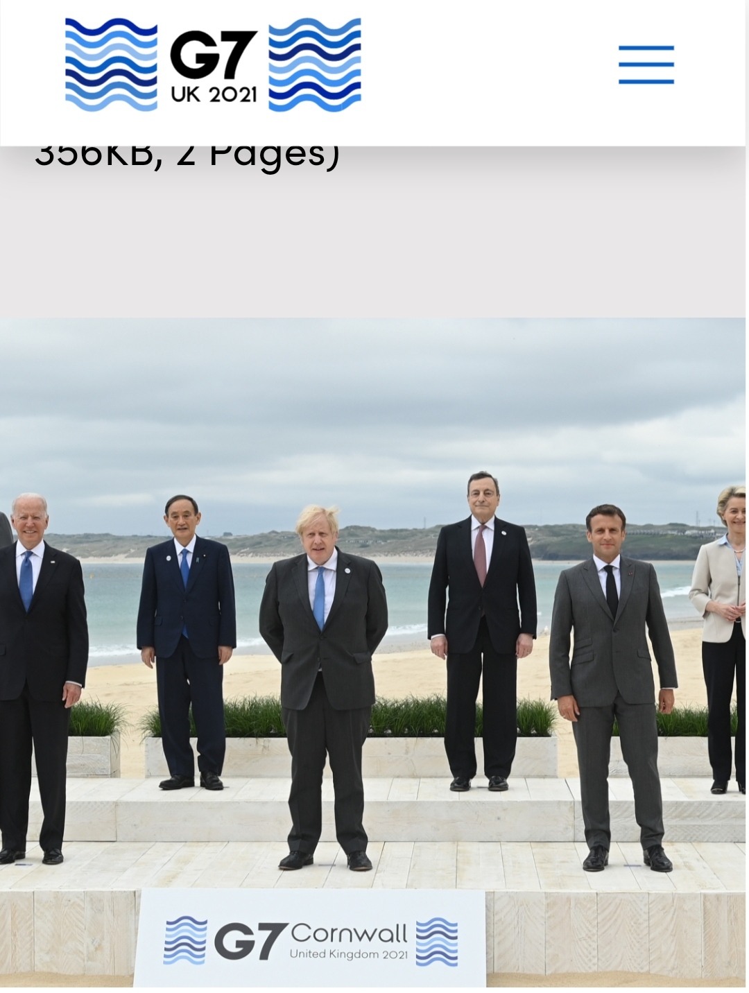 이 사진에서 올해 G7 정상회의 의장국인 영국의 보리스 존슨 총리가 앞줄 가운데에 섰고, 조 바이든 미국 대통령은 앞줄 오른쪽에 자리했다. 문 대통령은 그 사이에 섰다. 앞줄 맨 왼쪽은 시릴 라마포사 남아공 대통령이었다. 스가 총리는 두 번째 줄 맨 왼쪽이었다.