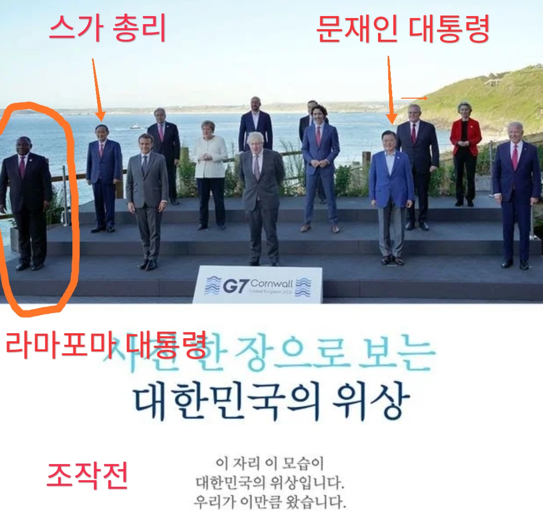 이 모습이 대한민국의 위상 남아공 대통령 삭제 日 스가 더 구석으로 존슨 총리-바이든 대통령 사이에 文대통령 더 중앙으로 당겨 논란 커지자 원본 사진으로 교체 더불어조작당 공식이미지..
