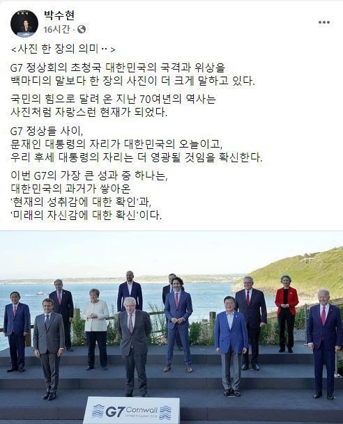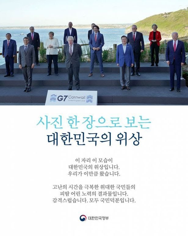 정부는 지난 12일(현지 시각) G7 정상회의가 열린 영국 남서부 콘월 카비스베이 정상회담장 앞에서 찍은 참가국 정상 기념사진을 이용해 홍보물을 만들었다. 제목은 ‘사진 한 장으로 보는 대한민국의 위상’이었다. “이 자리 이 모습이 대한민국의 위상입니다. 우리가 이만큼 왔습니다”, “위대한 국민들과 정부가 함께 해온 피땀 어린 노력의 결과물입니다. 감격스럽습니다. 모두 국민 덕분입니다”라는 글귀도 적었다.