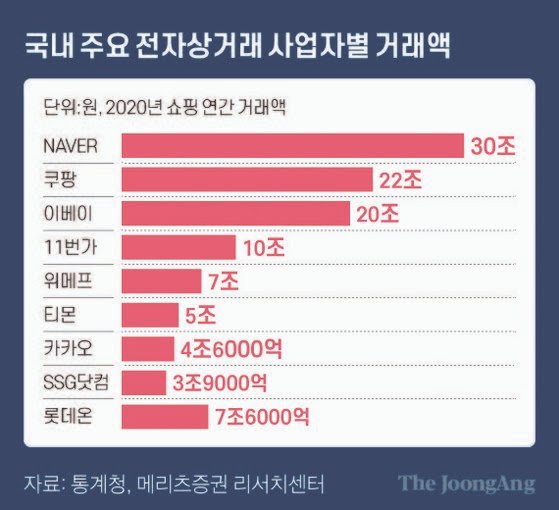 국내 주요 전자상거래 사업자별 거래액. 그래픽=차준홍 기자 cha.junhong@joongang.co.kr