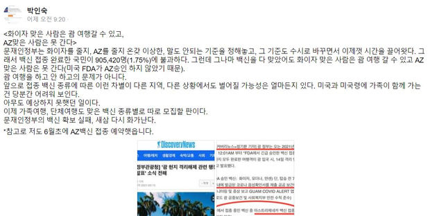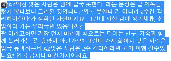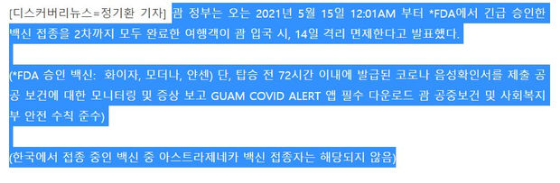 "그나마 백신을 다 맞았어도 화이자 맞은 사람은 괌 여행 갈 수 있고 AZ 맞은 사람은 못 간다( 미국 FDA가 AZ 승인 하지 않았기 때문)"이라고 이유를 밝혔습니다.