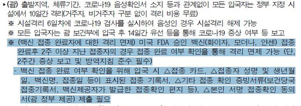 ■ "괌 입국시 6일째 격리 해제 가능… 화이자·모더나·얀센 접종시 면제 가능"
