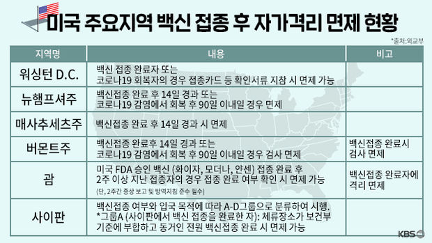 손영래 중수본 사회전략반장은 괌의 경우 "미국 FDA 승인 백신을 접종한 사람에 대해 격리를 면제하고 승인받지 않은 백신을 맞은 사람은 6∼7일 격리하되 중간에 검사 결과 음성이 나오면 격리를 해제하는 것으로 알고 있다"고 설명했습니다.