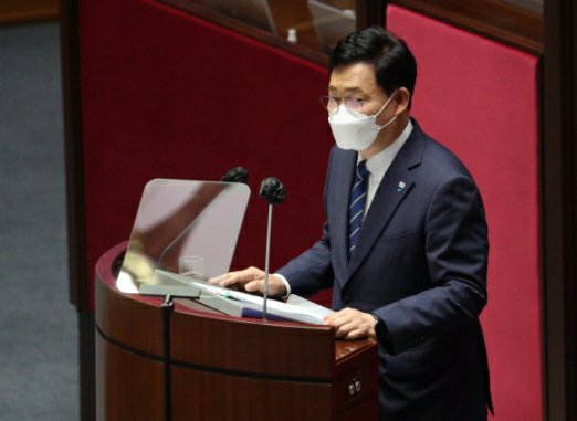 ▲ 더불어민주당 송영길 대표가 16일 오전 국회 본회의에서 열린 교섭단체대표연설에서 청년 특임장관 제안과 함께 강력한 주택 공급대책 조기 실현, 코로나 백신 자체 개발 지원, 검찰개혁, 미디어 환경 혁신을 약속하고 있다. 2021. 6. 16