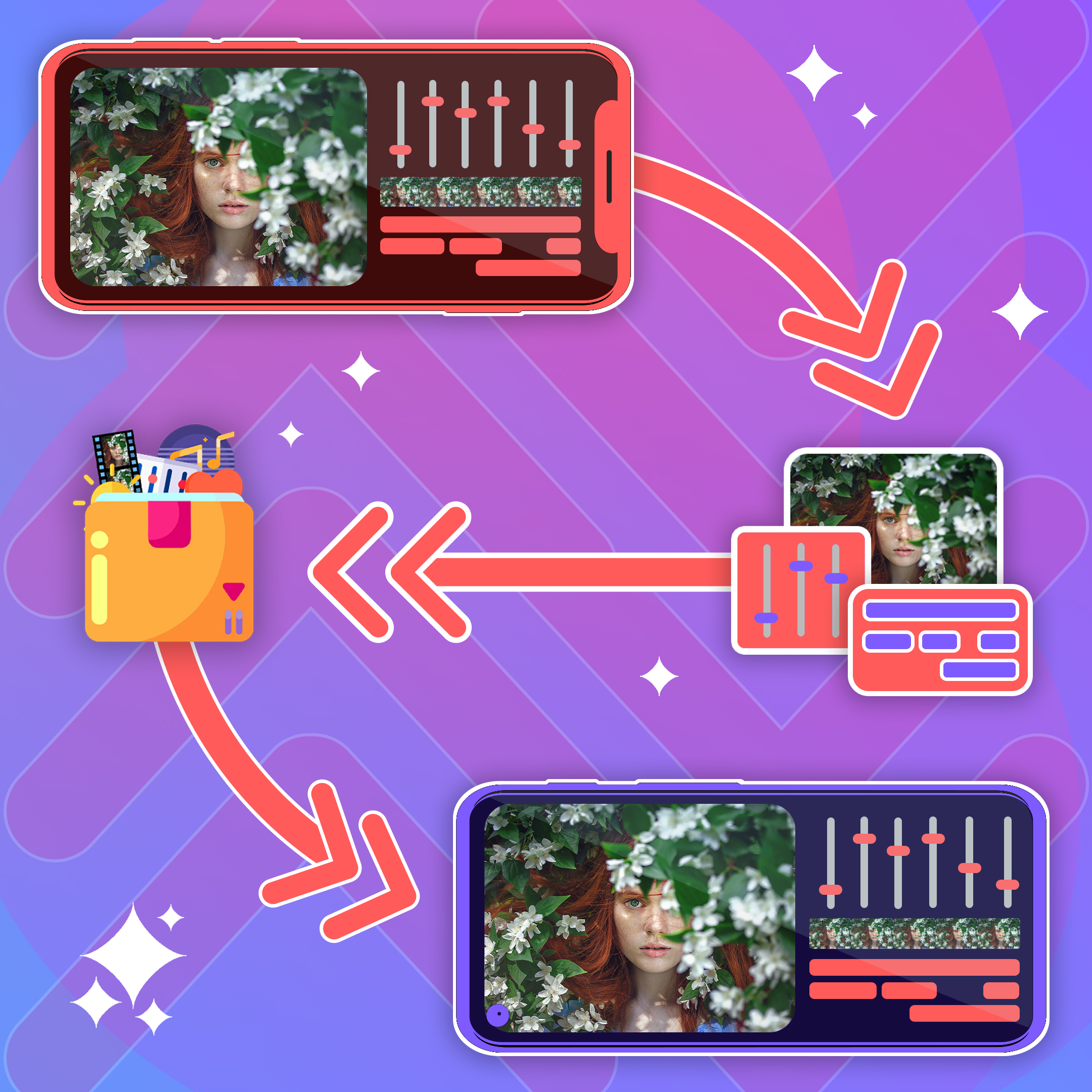 새롭게 추가된 키네마스터 프로젝트 내보내기 기능을 통해 동영상, 이미지, 스티커, 효과, 음원 등을 확장자 .kine 파일로 변환하여 다른 단말기로 이동하거나 다른 이용자와 공유할 수 있습니다!