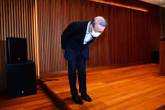 홍원식 남양유업 회장이 최근 자사 유제품 불가리스가 코로나19 억제 효과가 있다는 발표로 빚어진 논란과 관련해 남양유업 본사 대강당에서 대국민 사과를 한 뒤 회장식 사퇴를 발표하고 있다. 장진영 기자
