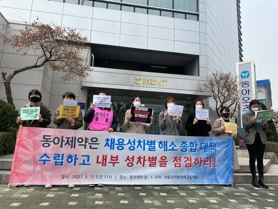 채용성차별철폐공동행동이 지난 3월 오전 서울 동대문구 동아제약 본사 앞에서 성차별 면접에 대한 사과를 요구하는 기자회견을 열었다. [사진 한국여성단체연합]