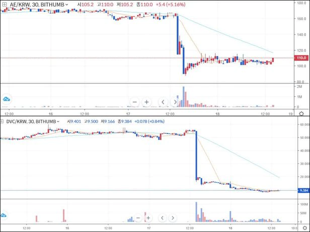 지난 17일 가상화폐 거래소 빗썸이 거래 지원 종료를 예고한 드래곤베인과 애터니티의 시세가 17일 급락한 이후 등락을 반복하고 있는 모습. /빗썸 캡처