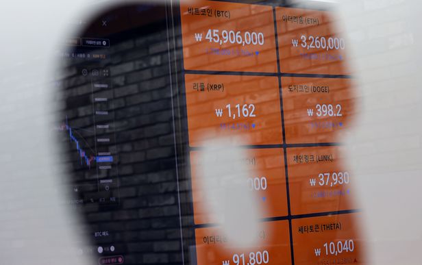 지난달 28일 오전 서울 강남구 빗썸 강남센터 라운지 전광판에 가상화폐 시세가 표시돼 있다. /연합뉴스