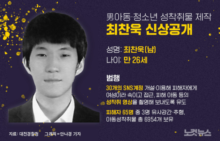 경찰 최찬욱, 신상공개 앞두고도 웃어 프로파일링 의뢰 5년간 성착취물 7천여개 제작 미성년자 피해자 300여 명, 만 11살도 SNS서 가짜 프로필 피해자 접근 알몸사진 등 약점 잡아 성착취물 제작