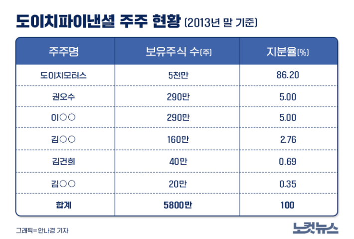 당시 윤 전 총장 배우자인 김 씨도 유상증자에 참여했다. 금융감독원 전자공시시스템 공시를 보면, 김 씨는 2013년 말 기준 도이치파이낸셜 주식 40만주를 보유하고 있다. 김 씨가 이 주식 40만주를 약 2억원, 즉 액면가(주당 500원)에 인수한 사실이 지난해 한 언론 보도로 알려지면서 특혜 논란이 일기도 했다.