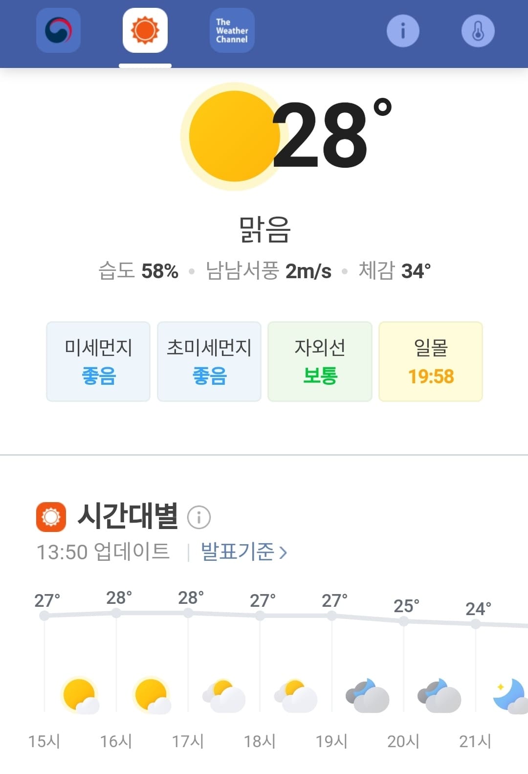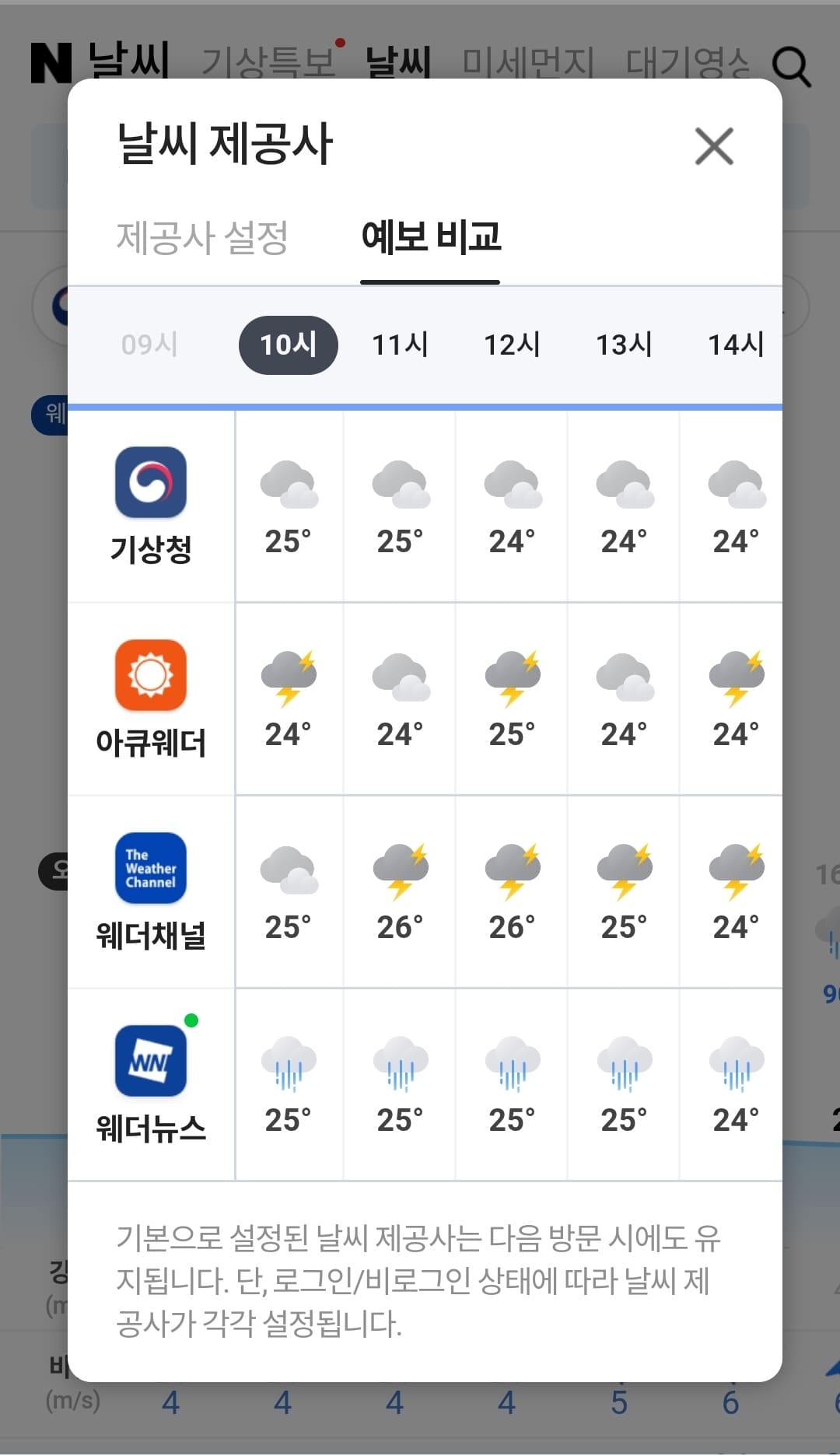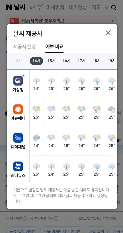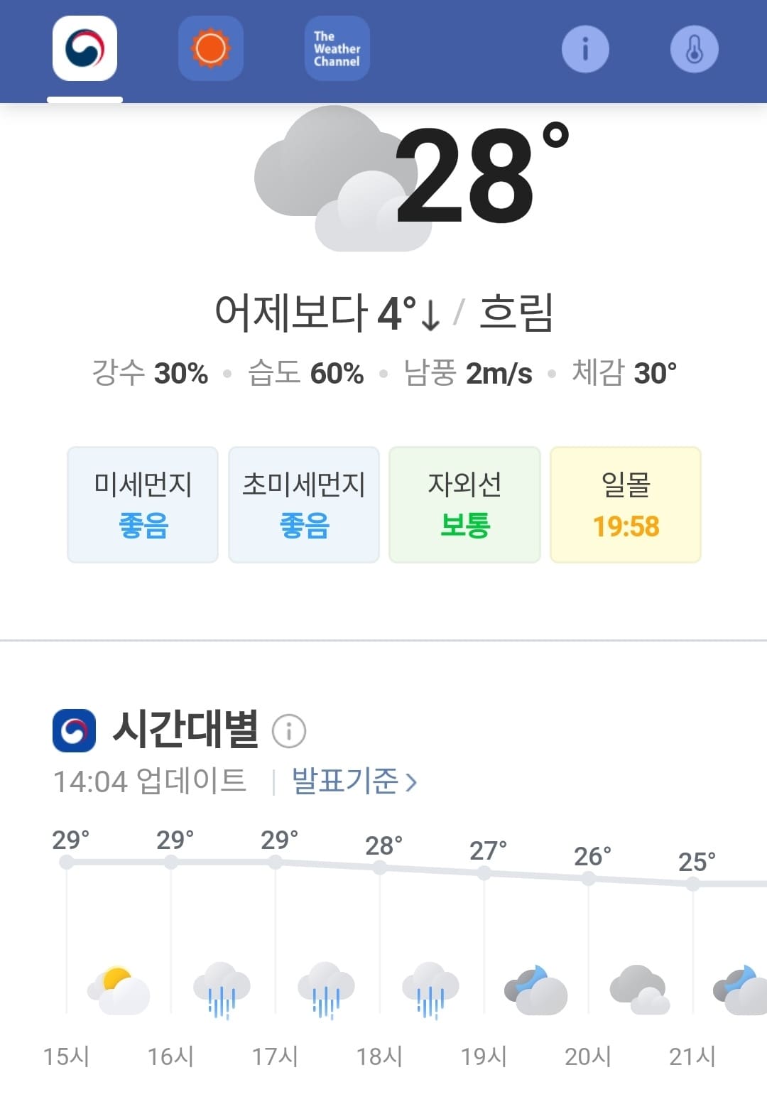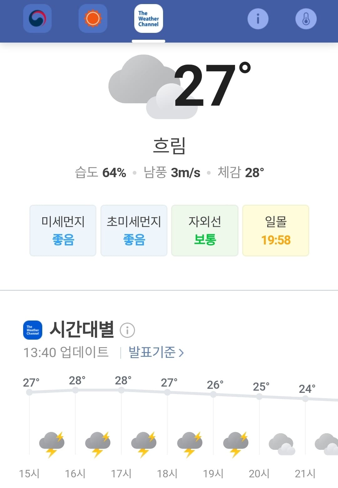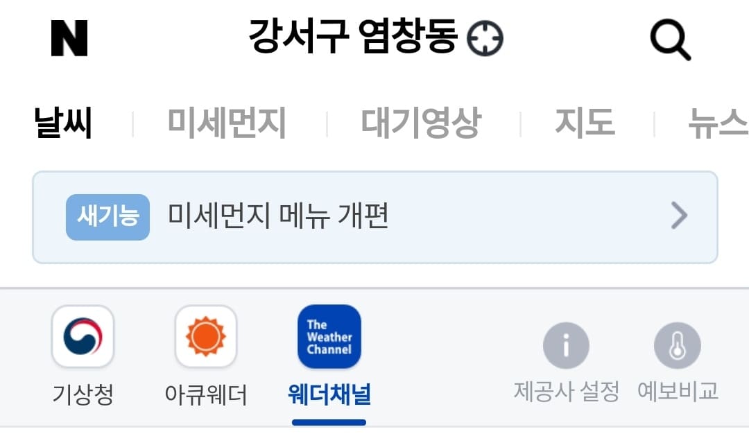 우선 아래에 있는 아이콘을 보면 "기상청" "아큐웨더" "웨더채널" 등 3개의 예보 기관이 있다.