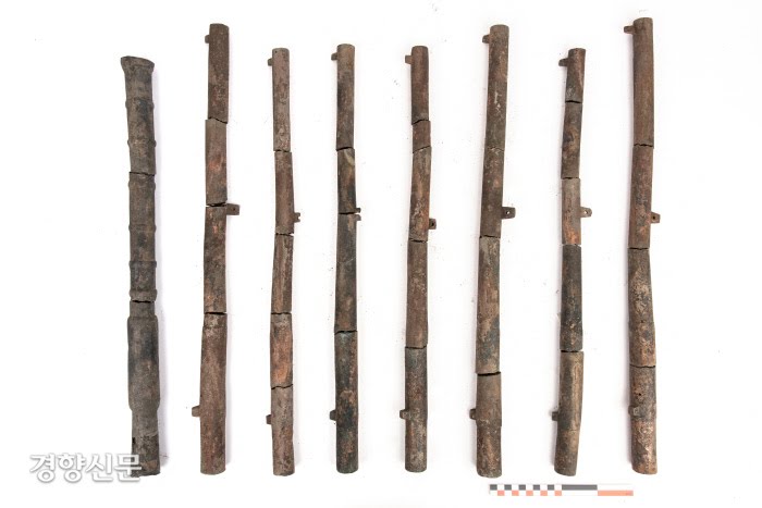 연구원은 승자총통(1583년) 1점, 소승자총통(1588년) 7점 등 총 8점의 총통도 찾았다. 기본형 총통을 고의적으로 절단한 후 묻은 것으로 보인다고 했다. 승자총통은 명량 해역에서도 확인됐다. 발굴 총통 제작자로 기록된 장인 희손과 말동 중 희손은 보물 ‘차승자총통’ 명문에도 나온다.