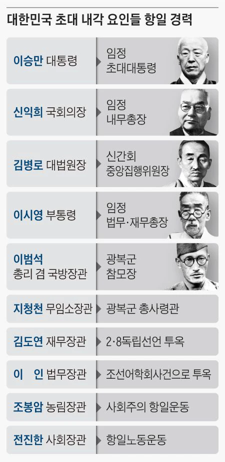 이시영 부통령은 1919년 임정 수립 때부터 참여해 법무·재무총장을 지내며 임정을 지킨 원로 독립운동가이다. 총리 겸 국방부장관인 이범석은 임정 산하 광복군 참모장 출신으로 1946년 광복군 500여 명과 함께 귀국해 건국에 앞장섰다. 지청천 무임소장관도 광복군 총사령관 출신으로 여순 사건이 발생하자 대책위원장을 맡았다. 이인 법무장관은 항일변호사 출신으로 조선어학회 사건으로 투옥됐고, 김도연 재무장관도 2.8독립선언, 조선어학회 사건으로 투옥된 독립운동가였다. 신복룡(79) 건국대 명예교수는 “대한민국 초대 내각이 친일세력으로 이뤄졌다는 건 전혀 사실이 아니다. 항일 독립운동가들이 다수였다”고 말했다.