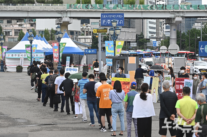 7일 오전 서울 중구 서울역광장에 마련된 임시선별진료소를 찾은 시민들이 신종 코로나바이러스 감염증(코로나19) 검체검사를 받기 위해 줄을 서 있다. 코로나19 신규 확진자가 7일 0시 기준 1212명을 기록하면서 4차 대유행에 진입했다. 지난해 3차 유행 당시 일일 최다 환자 발생 기록인 1240명에 이어 2번째로 많은 숫자다. 특히 수도권 지역발생 확진자만 990명(서울 577명, 경기 357명, 인천 56명)을 기록했다 이한형 기자