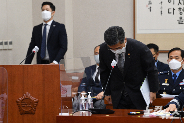 서욱 국방부 장관이 지난달 10일 국회에서 열린 법제사법위원회의 공군 부사관 성추행 사건 관련 긴급현안질의에 출석해 인사하는 모습. 윤창원 기자