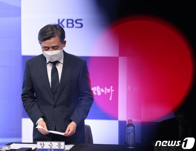 양승동 KBS 사장이 1일 오후 서울 여의도 KBS 별관에서 열린 텔레비전 방송 수신료 조정안 설명회에서 인사하고 있다. KBS이사회는 전날 수신료를 현행 월 2500원에서 3800원으로 52% 올리는 인상안을 통과시켰다. 그러나 이같은 인상안에 국민 여론·정치권의 반응이 차가워 국회 통과는 쉽지 않을 거라는 지적이 나오고 있다. 2021.7.1/뉴스1 © News1