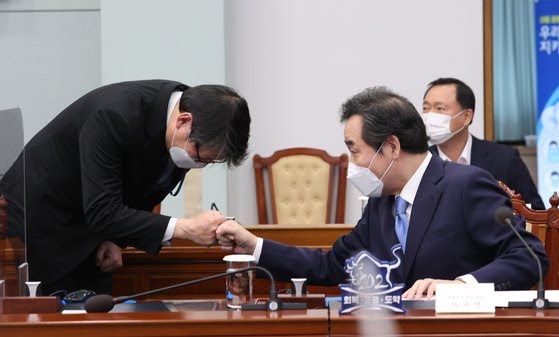 이광철 청와대 민정비서관이 3월 8일 오후 청와대에서 열린 법무부·행정안전부 업무보고에서 더불어민주당 이낙연 대표에게 인사하고 있다. 연합뉴스