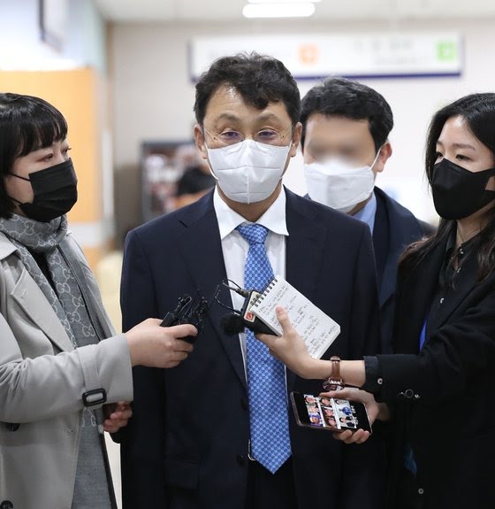 이진석 청와대 국정상황실장이 5월 10일 오후 서울 서초구 서울중앙지법에서 열린 청와대의 울산시장 선거개입·하명수사 의혹사건 첫 정식 재판에 출석하며 취재진의 질문을 받고 있다. 연합뉴스