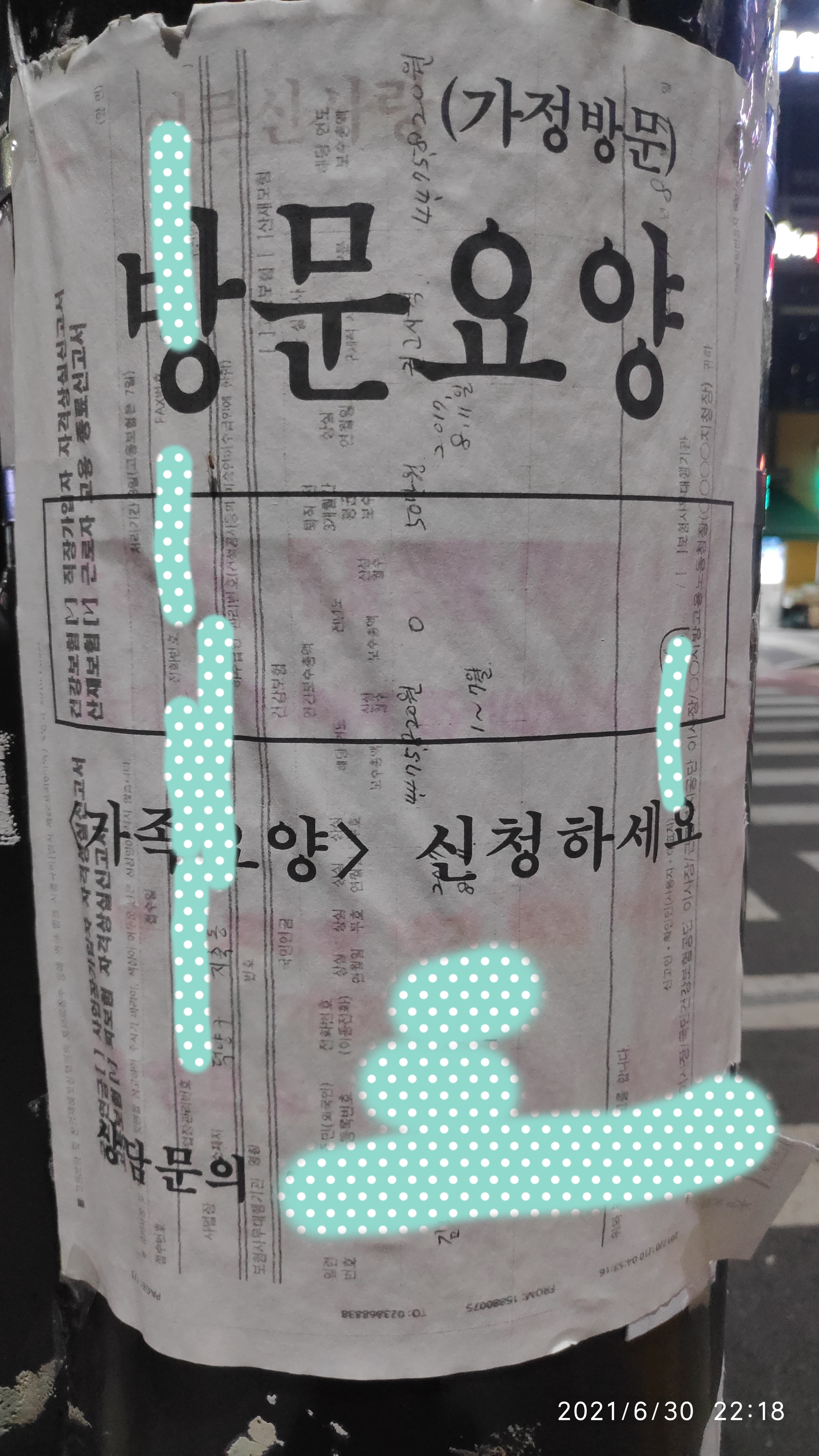 동네 마트를 가다가 건널목앞 전봇대에서 이상한 벽보를 보게 됐다. 큰 제목은 '방문요양 가족요양 신청하세요'라고 적혀있는 것 같은데, 배경에 있는 작은 글씨를 들여다 보고는 깜짝 놀랐다.