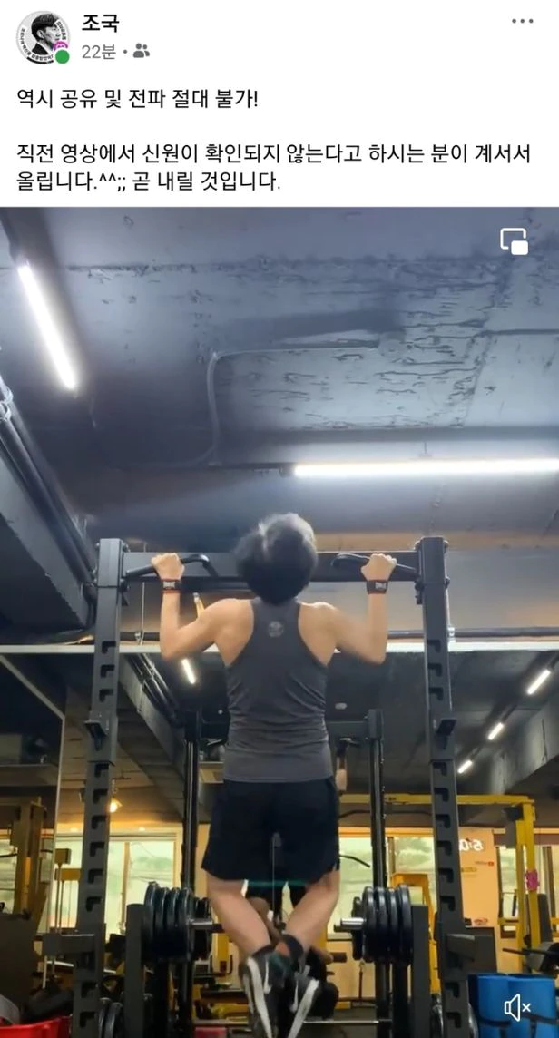 조 전 장관은 자신이 헬스장에서 턱걸이하는 뒷모습을 담은 영상을 최근 페이스북에 게재했다. “직전 영상에서 신원이 확인되지 않는다고 하시는 분이 계셔서 올린다”는 설명과 함께였다. 영상 속 조 전 장관은 어깨가 드러나는 민소매 운동복 차림이었다. 해당 글은 얼마 지나지 않아 삭제됐다.