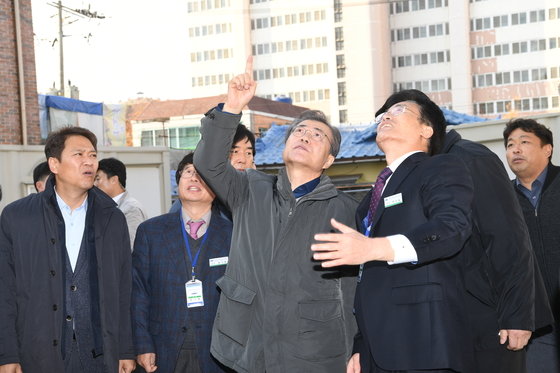 2017년 11월 포항 지진 피해 현장을 찾은 문재인 대통령이 포항여고를 둘러보고 있다. 박근혜 정부때 발생한 '세월호 사고'를 경험했던 문 대통령은 취임 직후인 2017년 "청와대가 재난의 컨트롤타워"라고 규정했다. 청와대 사진기자단