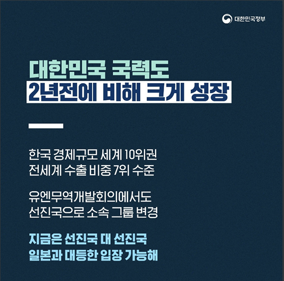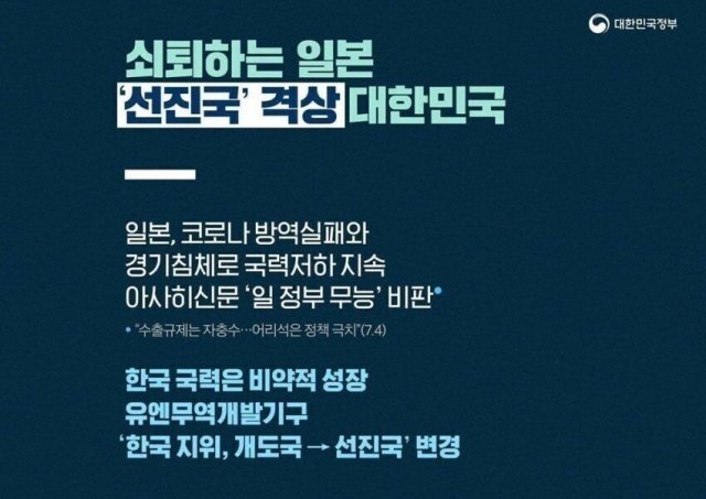 정부 “쇠퇴하는 일본” 게시물 수정 또 ‘외교 결례’ 논란 일본 코로나 방역실패와 경기침체로 국력저하 지속, 한국 국력은 비약적 성장, 한국지위 개도국→선진국 변경